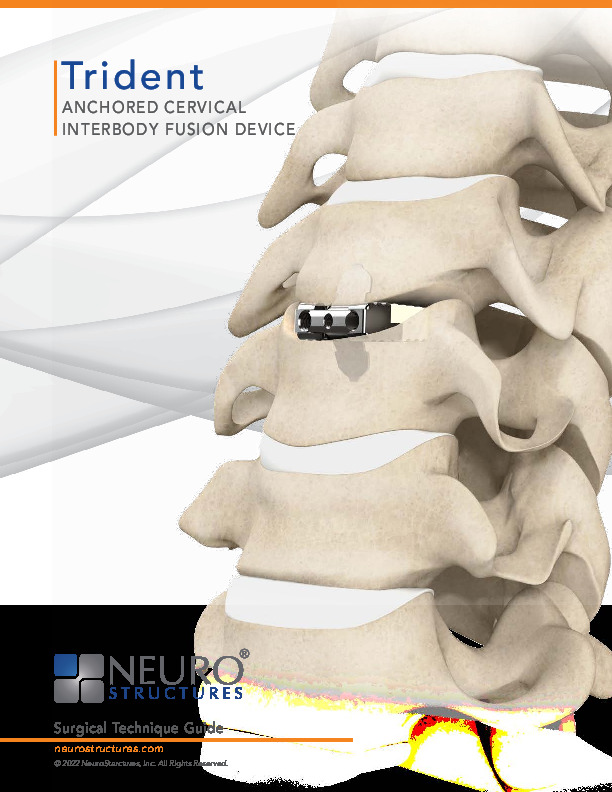 The Trident Anchored Cervical Interbody (ACI) fusion device by NeuroStructures/NuGen, is a lordotic zero-profile standalone PEEK and titanium spacer with an integrated anchor that allows for simple single-step implantation. It is designed as a radiolucent PEEK cage with a titanium anchor that is retractable for easy implant removal. The device is intended to be used with supplemental fixation (i.e. anterior cervical plate).