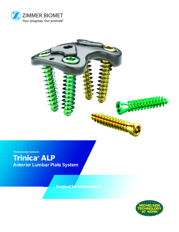 The Trinica ALP Anterior Lumbar Plating System by Zimmer-Biomet was acquired by Highridge Medical in 2024. The plate features a comprehensive system for anterior thoracolumbar fixation and includes a lumber plate version and a lumbar-sacral plate option.