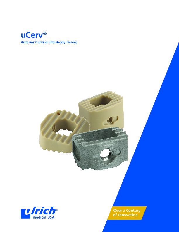 uCerv by Ulrich Medical USA is an anterior cervical interbody device that is available in radiolucent PEEK and titanium alloy implants. The bulleted tip allows for ease of insertion and self-distraction, and the optimal teeth patterns on the superior and inferior surfaces are created to limit migration. The titanium implants are designed with a roughened surface for improved bony adherence.