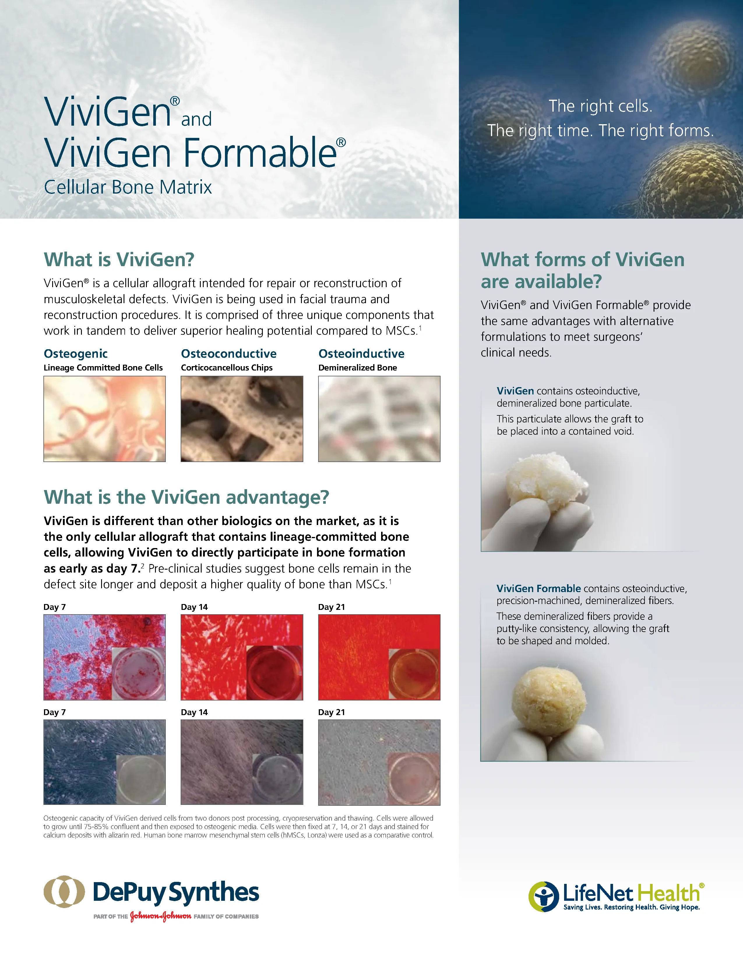 Vivigen and Vivigen Formable by J&J MedTech (Formerly Depuy-Synthes) is a cellular bone matrix allograft biologic prodhe uced by LifeNet Health and ditstributed under J&J MedTech. Vivgen and Vivigen Formable are composed of demineralized cortical/cancellous bone with viable cells cryopreserved and guarenteed to have 96% of viable cells post-thaw.
