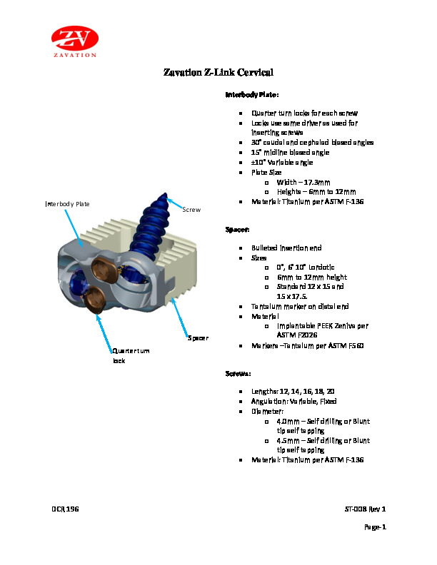 The Z-Link Anterior Cervical Stand Alone ACDF Spacer by Zavation is a PEEK spacer and a titanium anterior modular plate with 2 anterior locking screw fixation.