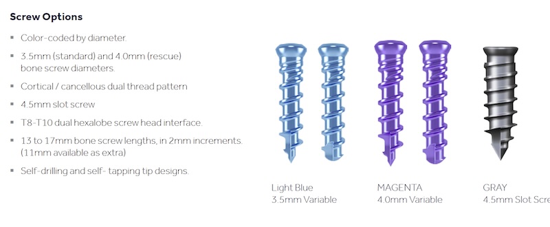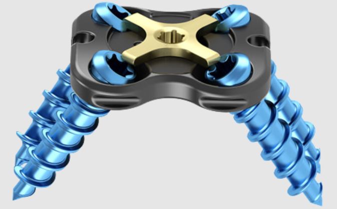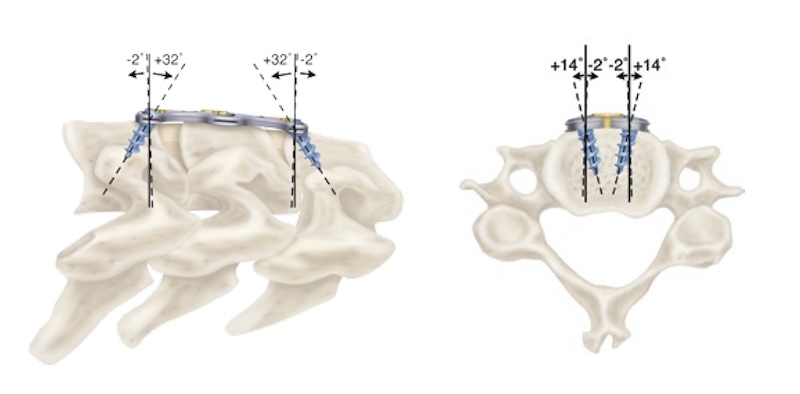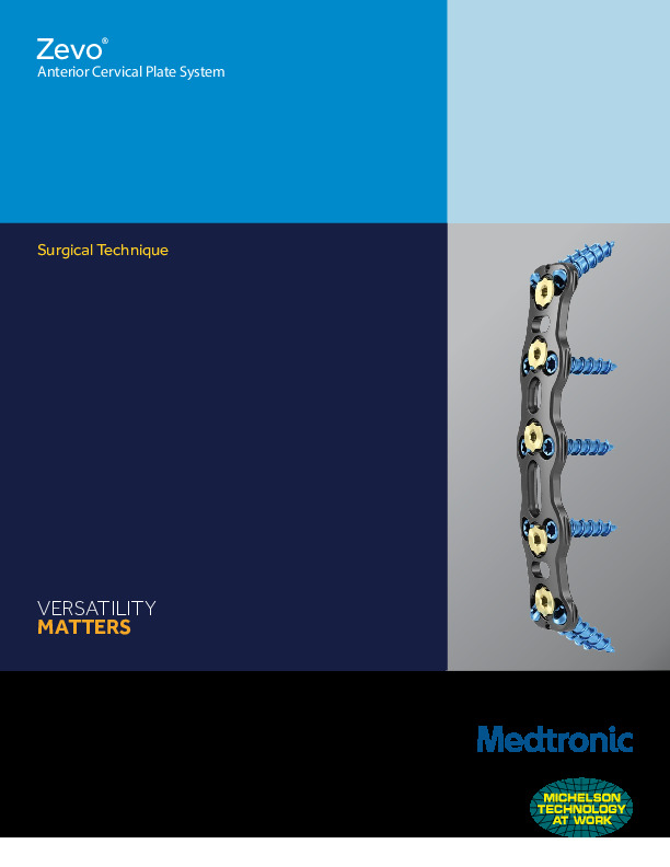 The Zevo is an Anterior cervical plate fixation system by Medtronic that utilizes a locking screw system with a high angle at the superior and inferior ends designed to minimize plate extension to decrease risk of adjacent segment disease. If features a 35 degree angulation at the superior and inferior screw holes.